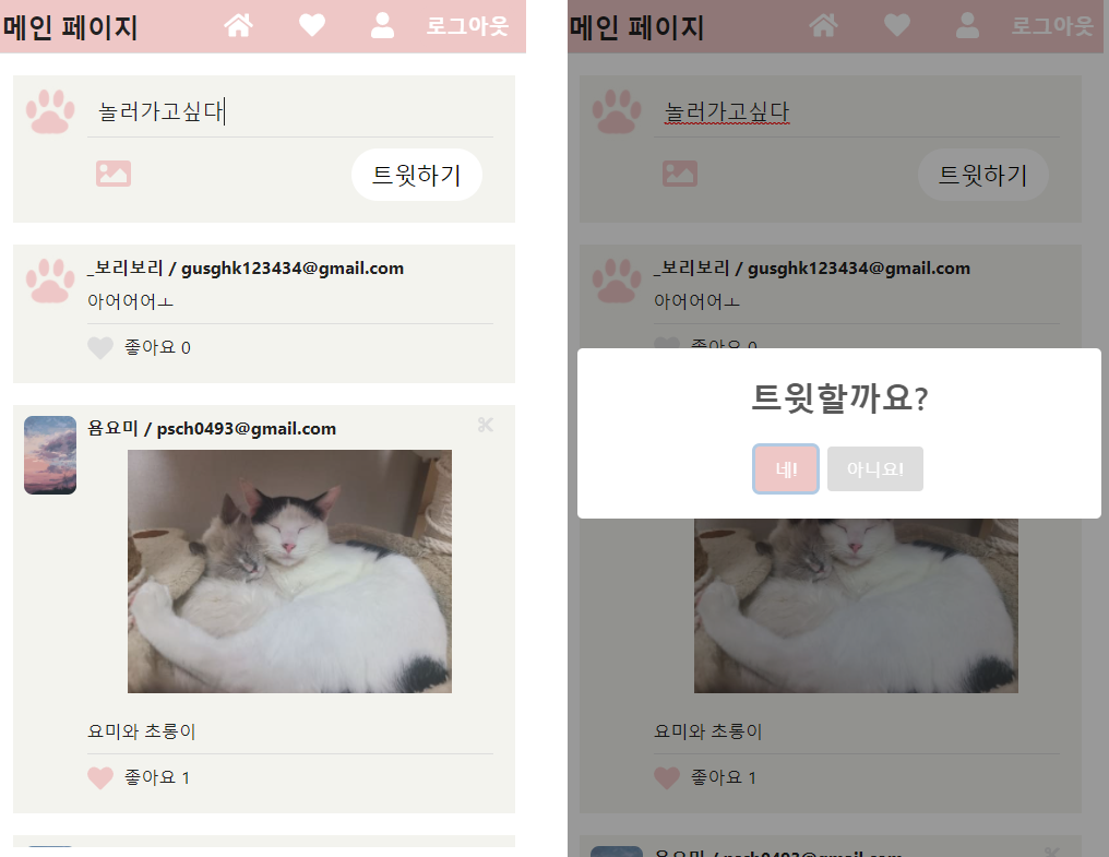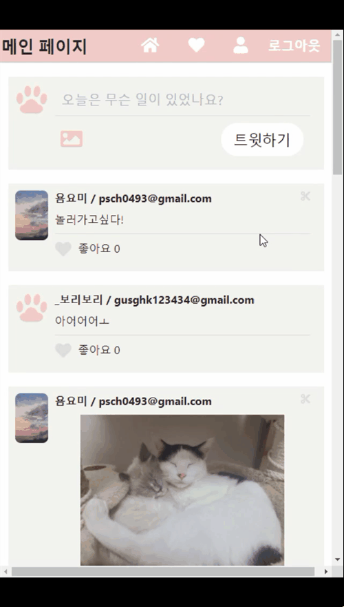 메인화면에선 모든 사용자의 트윗을 확인할 수 있으며, 하트를 누르면 해당 트윗을 좋아요 페이지에서 따로 확인할 수 있게 된다.